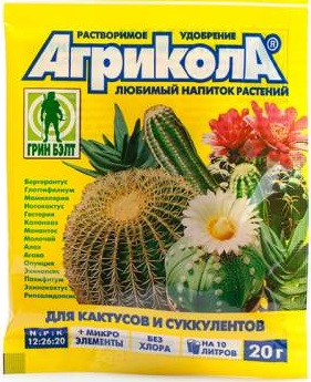Агрикола для кактусов и суккулентов.Состав: (NPK 12:26:20+микроэлементы).Пакет 20 г.Результат подкормки кактусов удобрением Агрикола - нежные цветы среди колючек на цветущих видах и быстрый рост всех видов кактусов и суккулентов. Необходимо для активного роста следующих видов: Агава, Алоэ, Бергерантус, Глоттифилиум, Гастерия, Гимнокалициум, Каланхоэ, Молочай, Монантес, Мамиллярия, Нотокактус, Опунция, Пахифитум, Рипсалидопсис, Эхинокактус, Эхинопсис и многих др.Характеристики