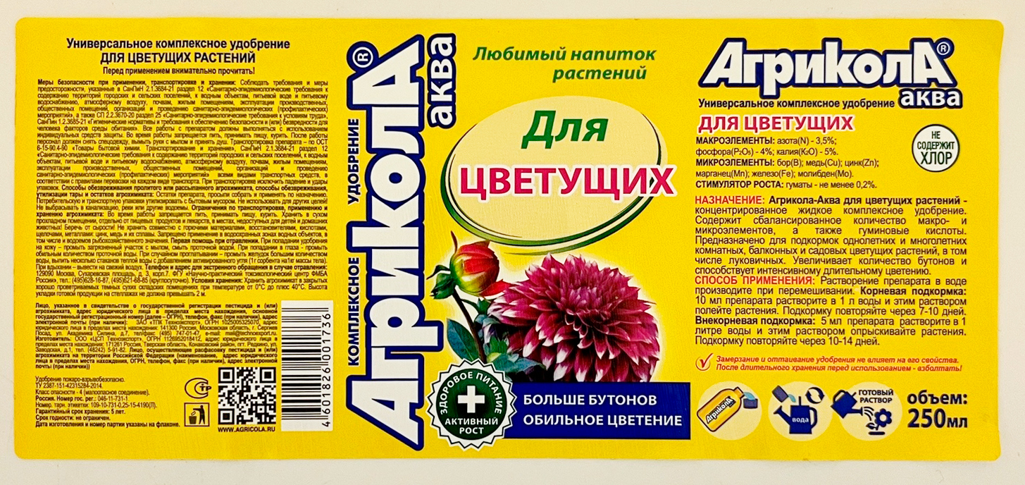 --Агрикола Аква для цветущих 250мл 04-442СеменаПосадочный материалГоршки, кашпо, ящики для рассадыУкрашения и дизайн дачного участкаГрунтУдобрения, стимуляторыЯдохимикаты (пестициды)От комаров тараканов муравьев мышей крыс кротовИнструмент, оборудование садовоеТовары для животныхКухня садоводаФлористические материалыЛитератураФитолампыПоливочное оборудование