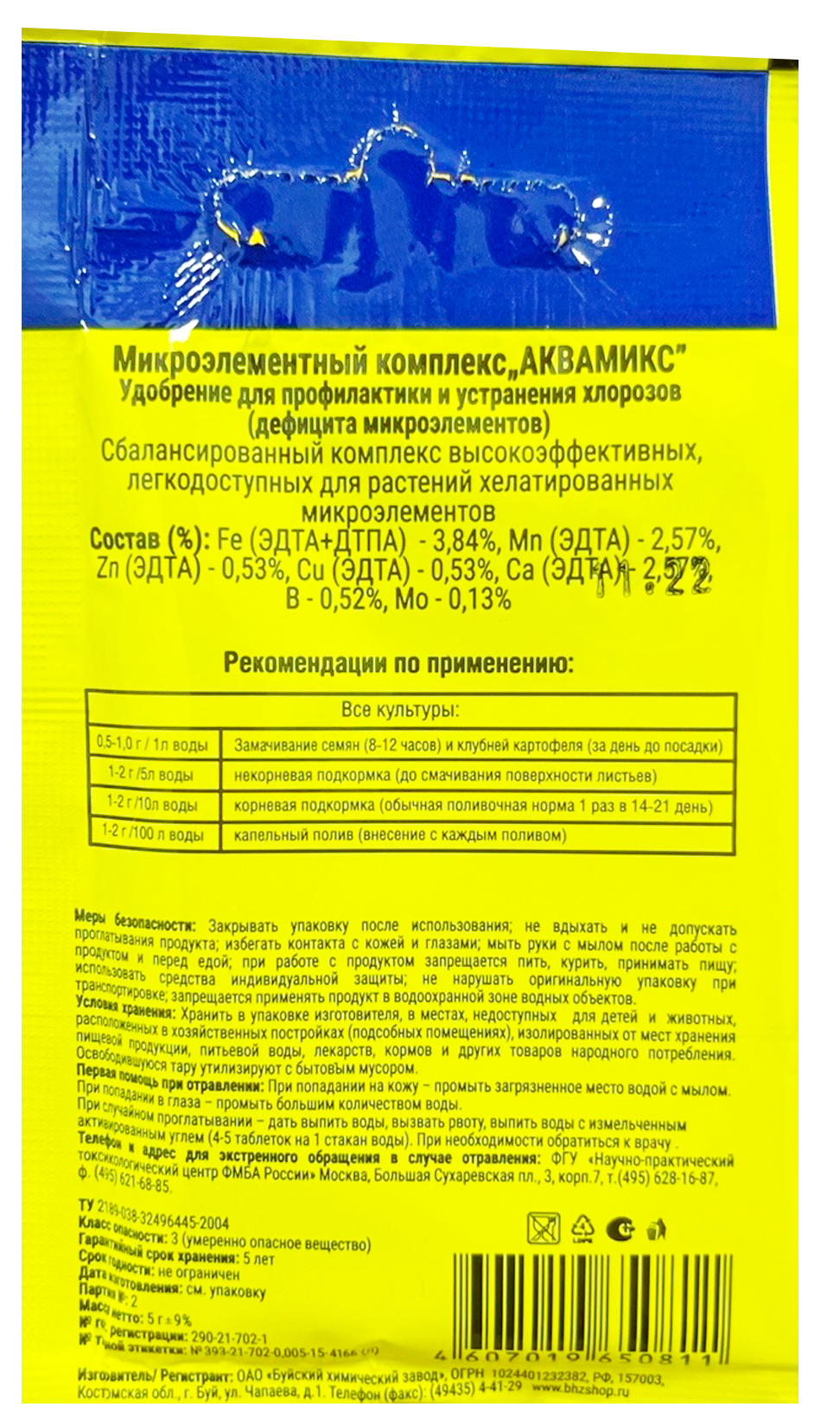 Аквамикс комплекс микроэлементов 5г Буйский ХимзаводНазначение: удобрение для профилактики и устранения дефицита микроэлементов, средство для замачивания семян.
