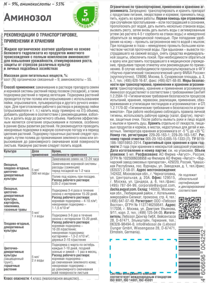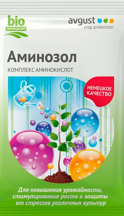 Аминозол - уникальная органическая подкормка с комплексом аминокислот для различных культур.В его состав включены более 20 связанных аминокислот животного происхождения, которые участвуют во всех важных процессах жизнедеятельности, а также в синтезе фитогормонов. Например, образуют индол-3-уксусную кислоту, которая действует как регулятор роста. Аминокислоты необходимы растениям при неустойчивой погоде, которая характерна весной, при резких сменах температуры (ночные или утренние заморозки), а также при стрессе, связанном с посадкой и пересадкой.