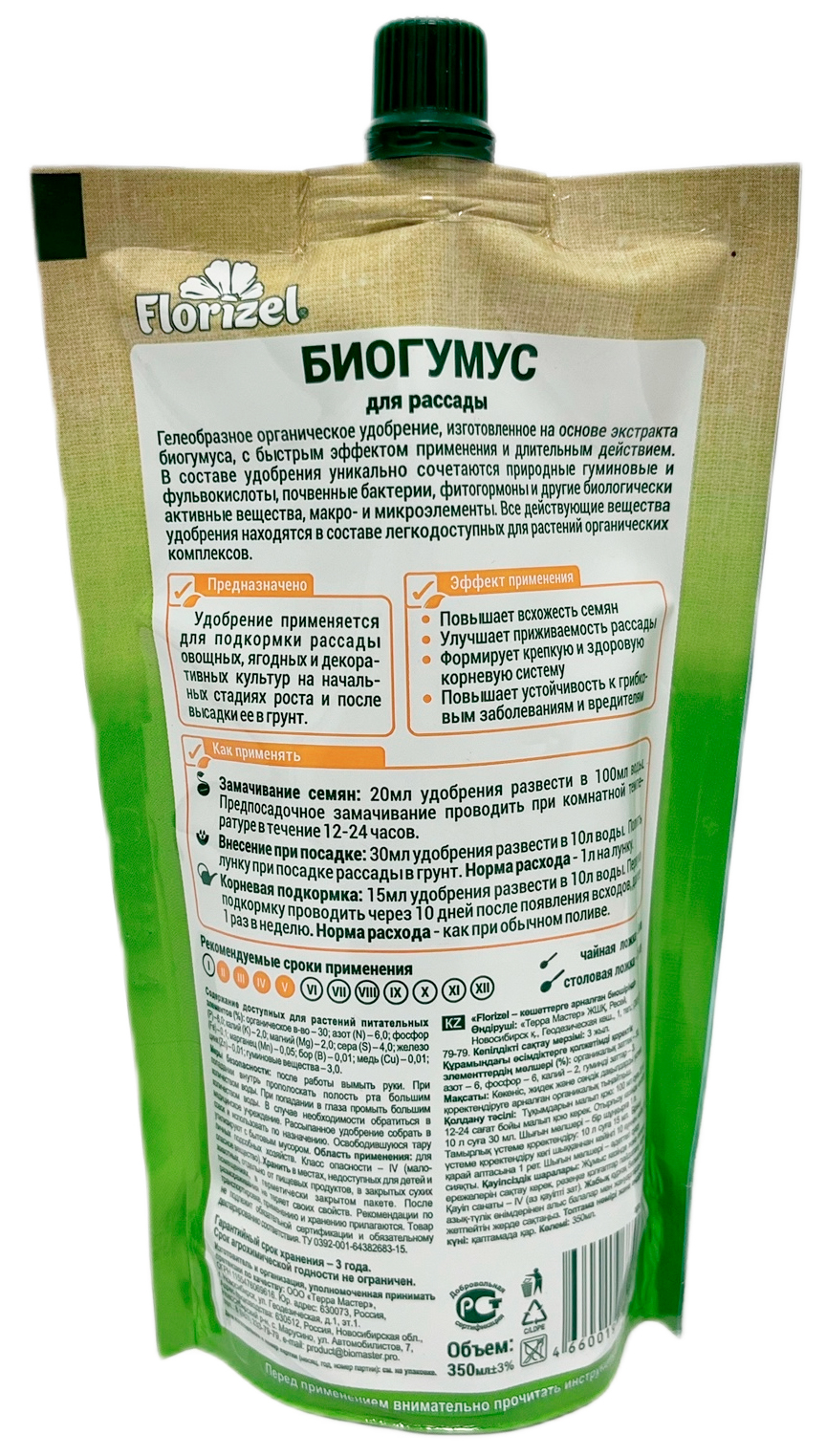 БИОГУМУС для рассады FLORIZEL 350 млВыращиваете рассаду собственноручно?! Избавьте себя от хлопот с помощью Биогумус геля для рассады. Удобрение обеспечит молодые растения всеми необходимыми для роста и здоровья питательными веществами, а вас крепкой и жизнеспособной рассадой.
