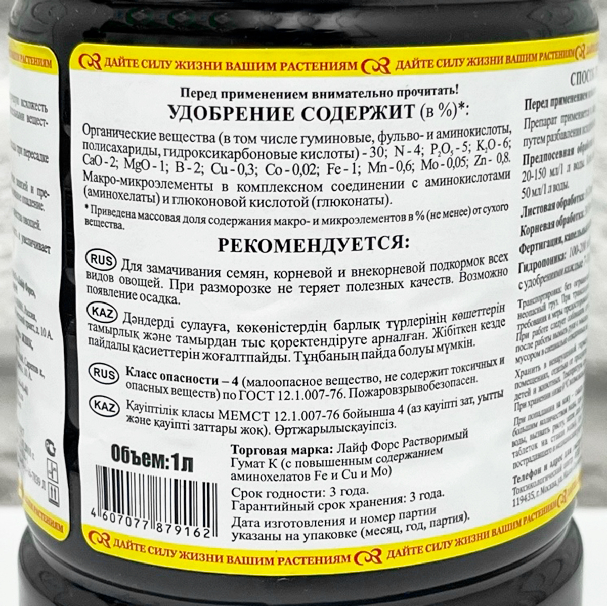 Состав: гуминовые и аминокислоты, витамины - 30%, Азот (N) - 4%, Фосфор (P2O5) - 5%, Калий (K2O) - 6%, Магний (MgO) - 1%, Бор (B) - 2%, Кобальт (Co) - 0,02%, Железо (Fe) - 1%, Марганец (Mn) - 0,6%, Молибден (Mo) - 0,05%, Цинк (Zn) - 0,8%.