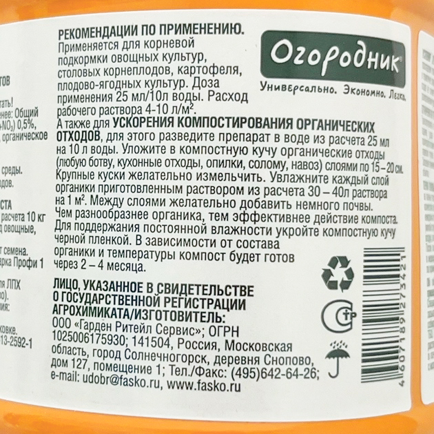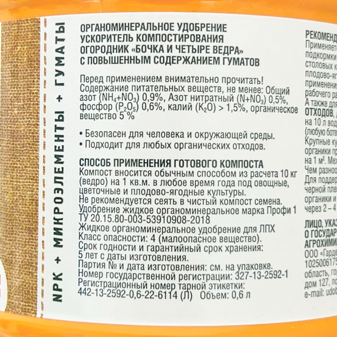 ЖКУ БОЧКА И ЧЕТЫРЕ ВЕДРА ОГОРОДНИК УСКОРИТЕЛЬ КОМПОСТА 0,6л- Безопасен для человека и окружающей среды;