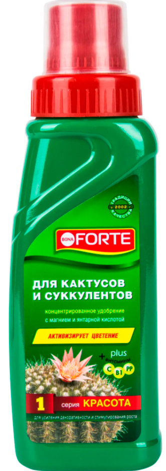 Бона Форте 1 Красота Для кактусов 0,285лЖидкое удобрение Bona Forte предназначено для кактусов, алоэ, суккулентов, толстянковых и молочайных культур. Оно содержит комплекс веществ необходимых для сбалансированного и полноценного питания растений. Минеральные элементы, входящие в состав продукта, восстанавливают первоначальную свежесть и зелень листвы, а также предотвращают преждевременное старение растений. Комплекс витаминов повышает стойкость растений к различным неблагоприятным воздействиям окружающей среды.