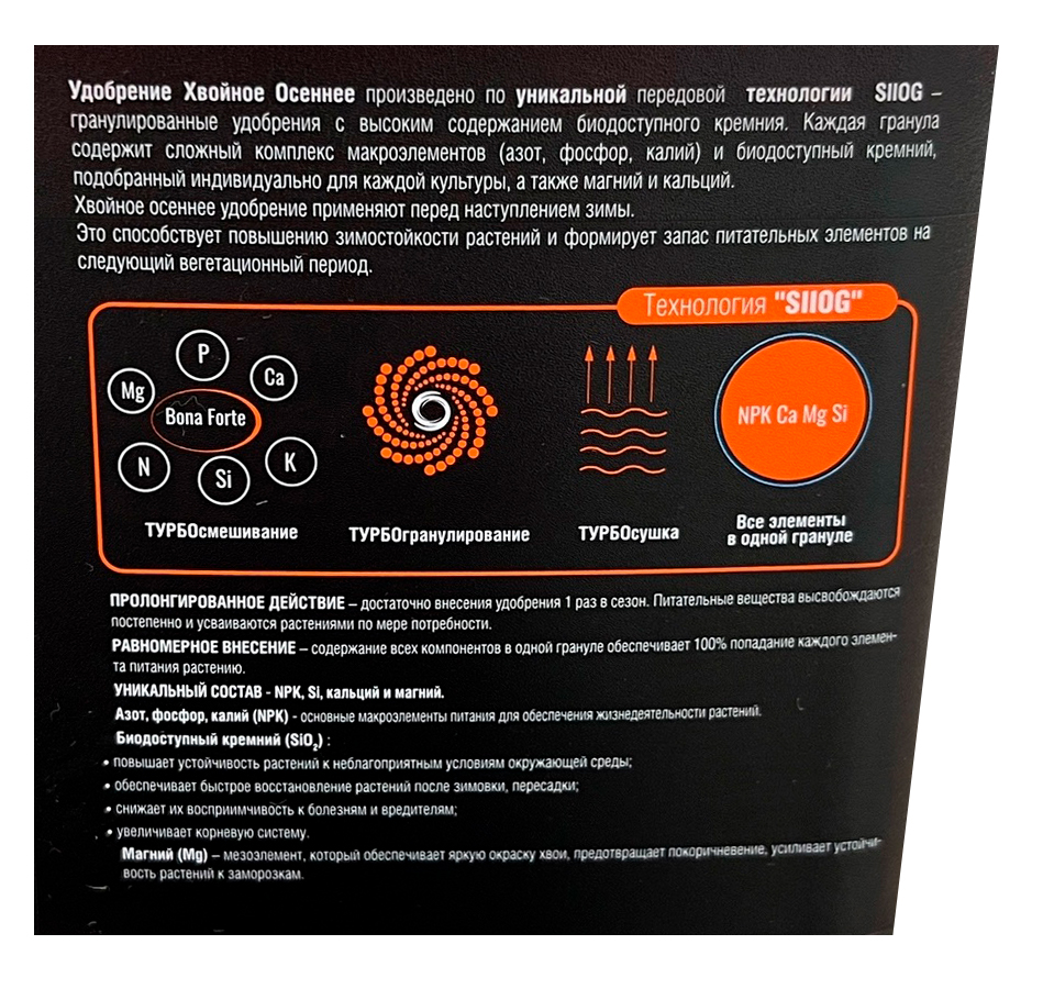 Удобрение Bona Forte хвойное осеннее с биодоступным кремнием, гранулы, ведро, 1 л.Удобрение Хвойное Осеннее произведено по уникальной передовой технологии SIIOG - гранулированные удобрения с высоким содержанием биодоступного кремния. Каждая гранула содержит сложный комплекс макроэлементов (азот, фосфор, калий) и биодоступный кремний, подобранный индивидуально для каждой культуры, а также магний и кальций.