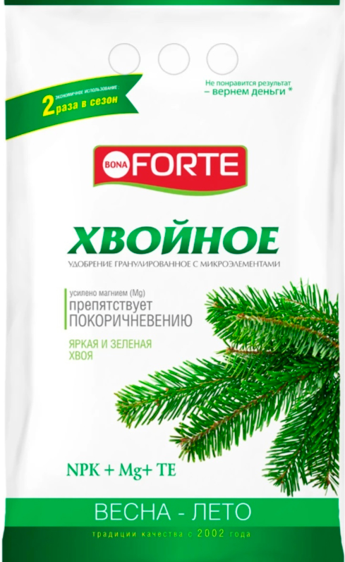 Удобрение Bona Forte Хвойное с микроэлементами 2 кг подходит для елей, сосен, кипарисов, тиса, кедра, можжевельника, туи, пихты, лиственницы и других хвойных растений.Состав: N:P:K + S + Mg + TE (азот, фосфор, калий+ сера + магний + микроэлементы в легкоусвояемой форме)