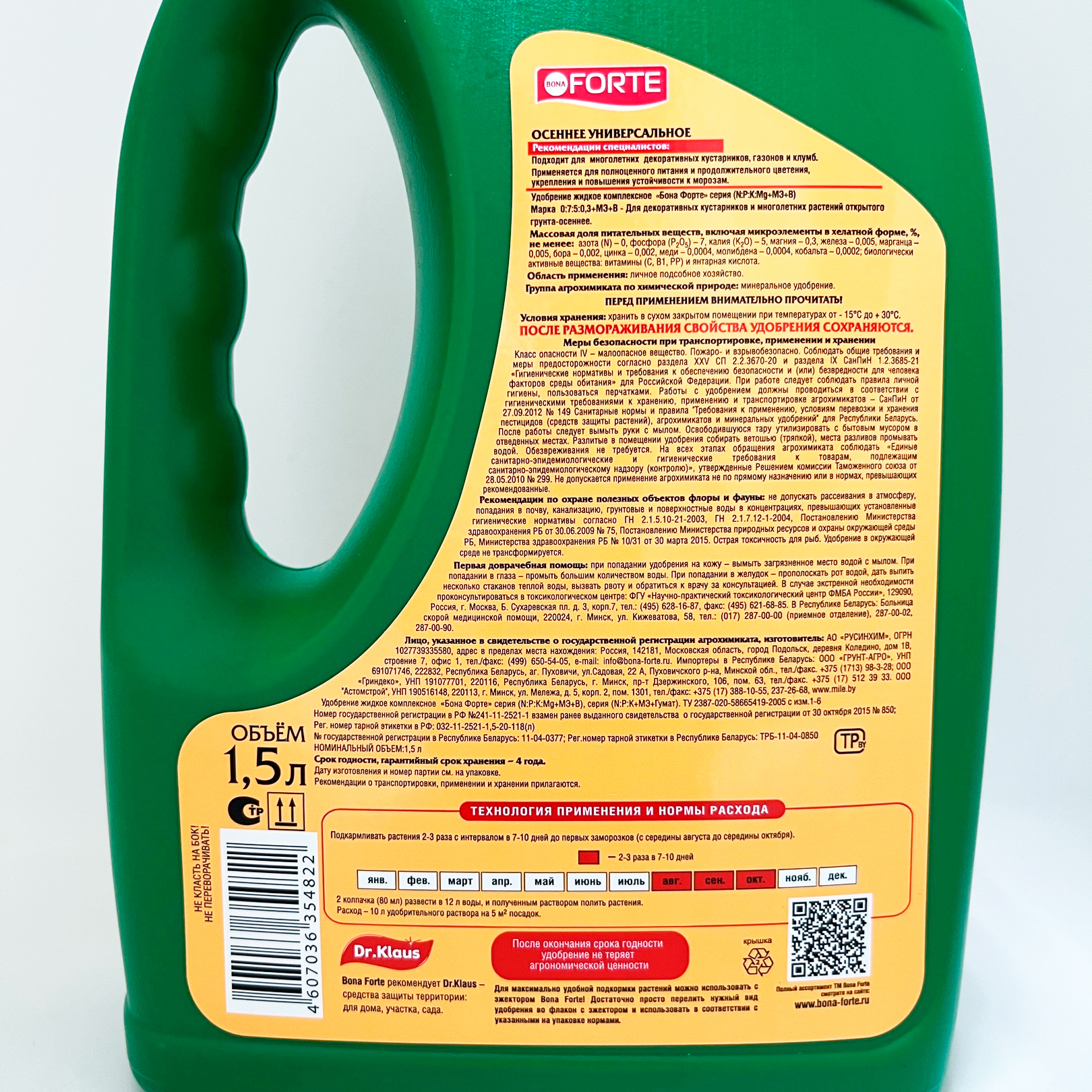 Бона Форте удобрение Лето-Осень 1,5 лМинеральное удобрение для открытого грунта создано лабораториями Bona Forte для усиления корнеобразования и морозоустойчивости растений.