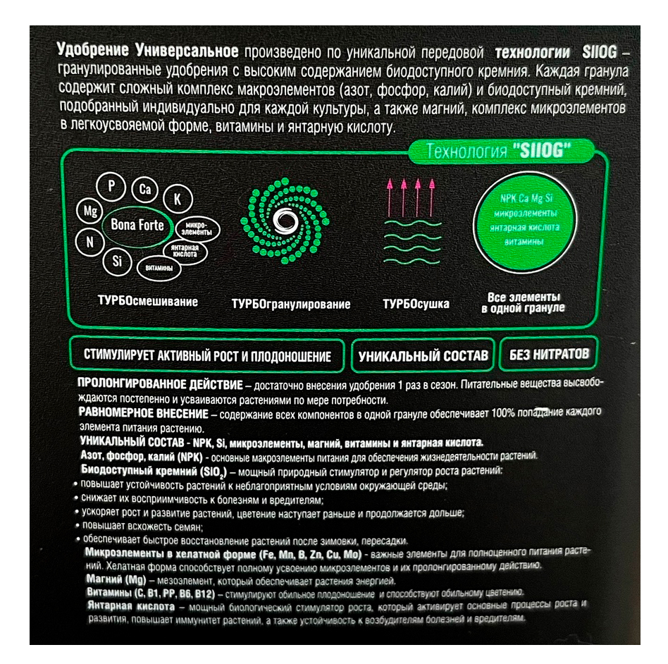 Удобрение универсальное с кремнием Bona Forte Turbo 1 л - гранулированное пролонгированное удобрение для овощных, плодовых и декоративных культур.УНИКАЛЬНЫЙ СОСТАВ В 1 ГРАНУЛЕ: N:P:K + Si + Mg + Са + TE + V+SA (азот, фосфор, калий+ биодоступный кремний + магний, + кальций + микроэлементы + витамины+янтарная кислота).