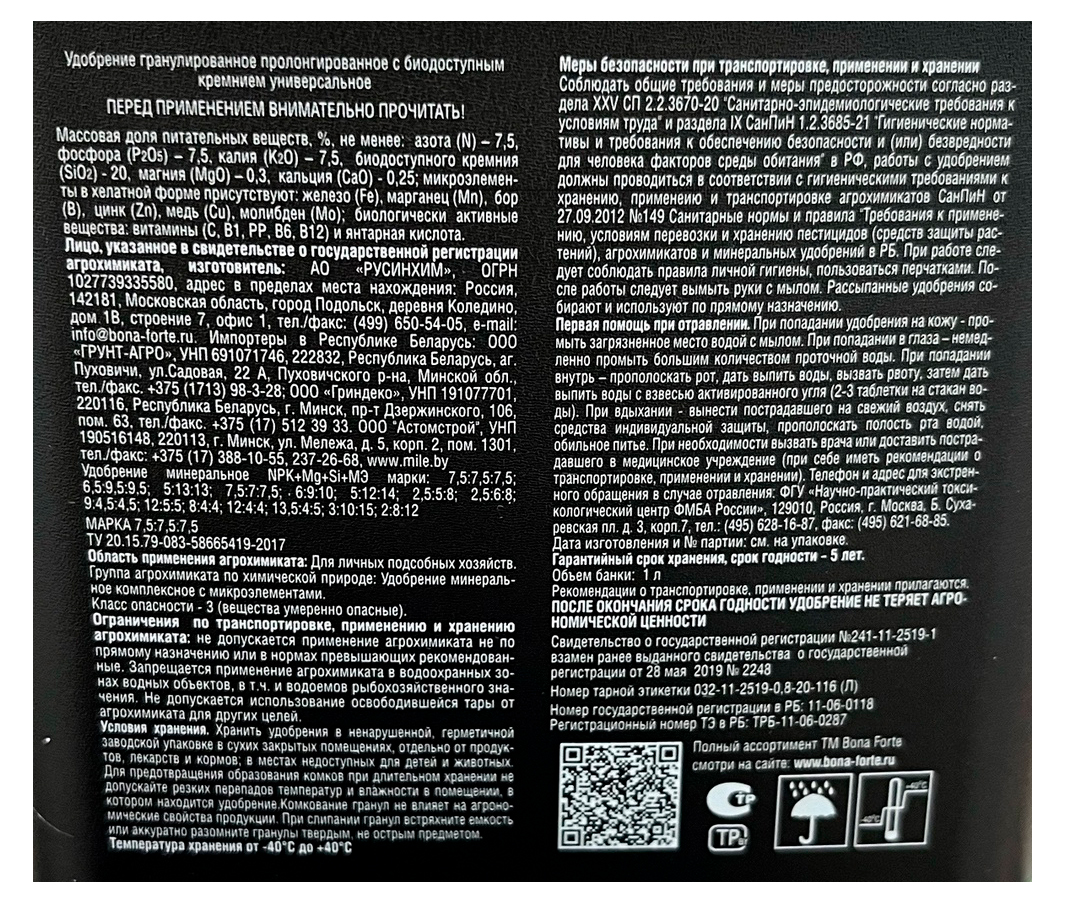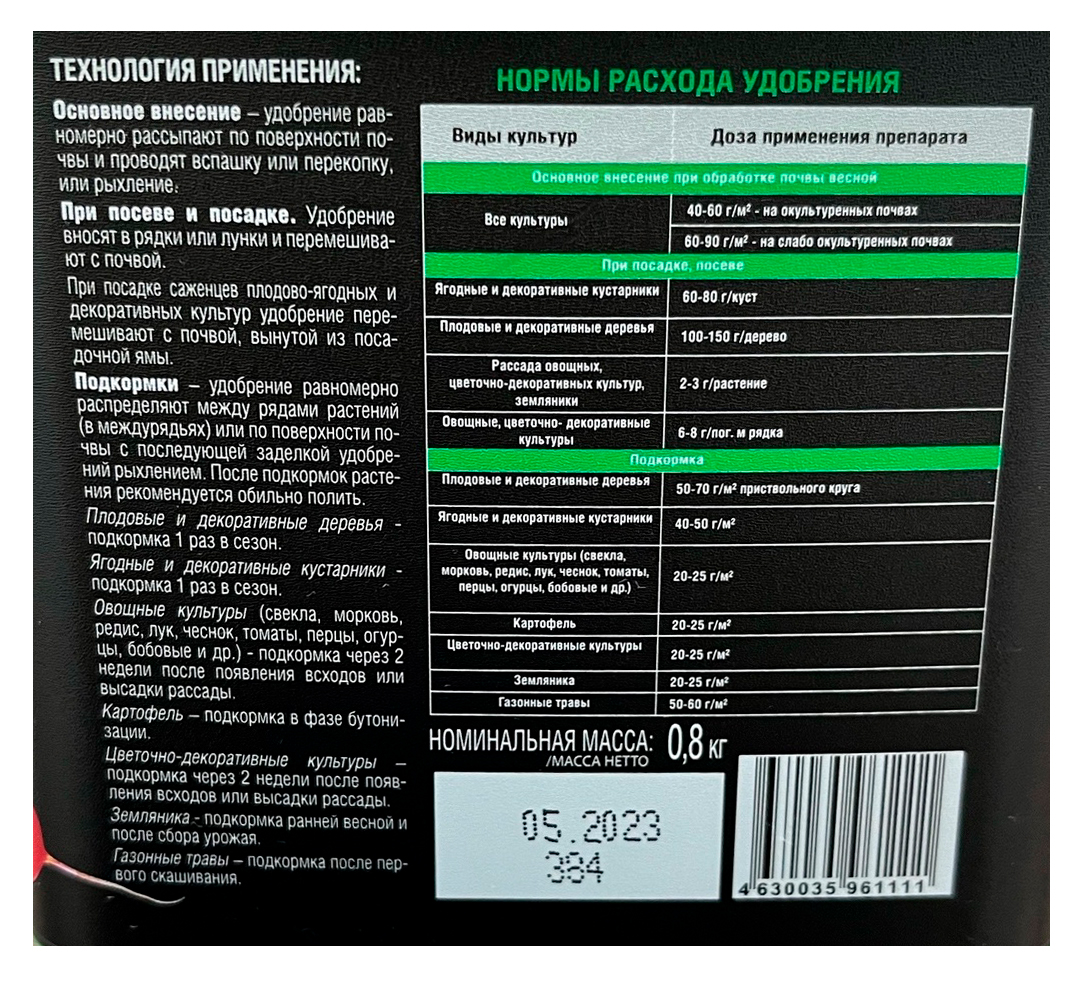 Применение: Основное внесение – удобрение равномерно рассыпают по поверхности почвы и проводят вспашку или перекопку, или рыхление. При посадке саженцев – удобрение перемешивают с почвой, вынутой из посадочной ямы. Подкормки – удобрение равномерно распределяют по поверхности почвы с последующей заделкой удобрений рыхлением. После подкормок растения рекомендуется обильно полить. Плодовые и декоративные деревья - подкормка 1 раз в течение сезона. Ягодные и декоративные кустарники - подкормка 1 раз в течение сезона. Овощные культуры (свекла, морковь, редис, лук, чеснок, томаты, перцы, огурцы, бобовые и др.) - подкормка через 2 недели после появления всходов или высадки рассады. Картофель – подкормка в фазе бутонизации. Цветочно-декоративные культуры – подкормка через 2 недели после появления всходов или высадки рассады. Земляника - подкормка ранней весной и после сбора урожая. Газонные травы – подкормка после первого скашивания.