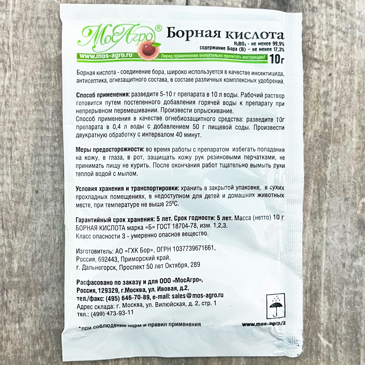 Борная кислота 10г МосАгроСостав: H3B03 не менее 99,9%, содержание Бор (B) - не менее 17,3%.
