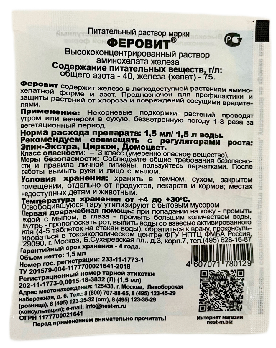 Феровит Нэст М 1,5млСодержание питательных веществ: г/л общего азота -40, железа (хелат) -75.
