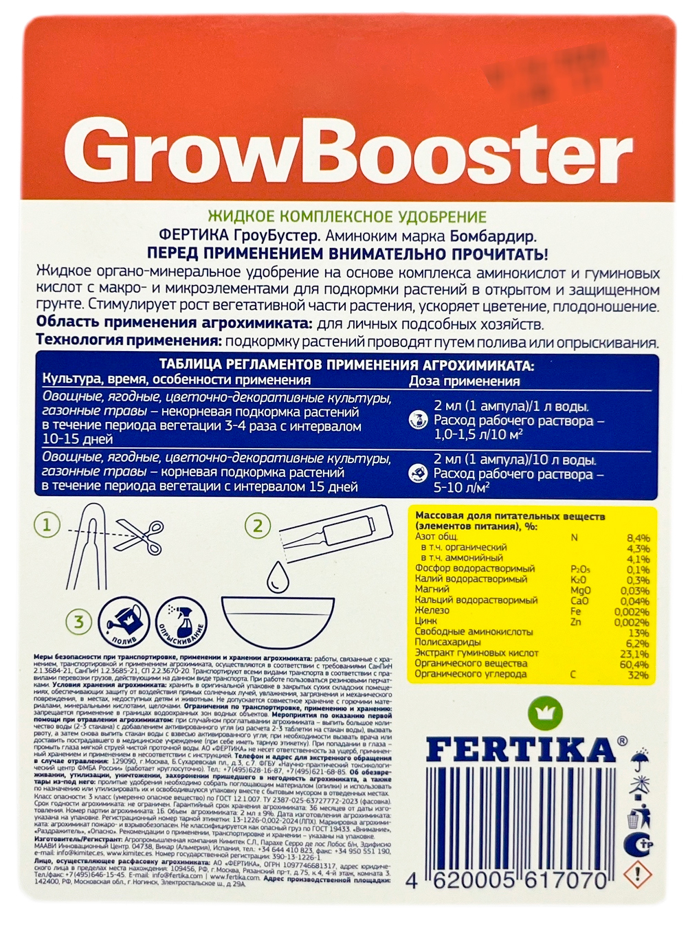 Фертика ГроуБустер создан на основе комплекса аминокислот и гуминовых кислот с каро- и микроэлементами для подкормки растений в открытом и защищенном грунте. Стимулирует рост вегетативной части растения, ускоряет цветение, плодоношение.