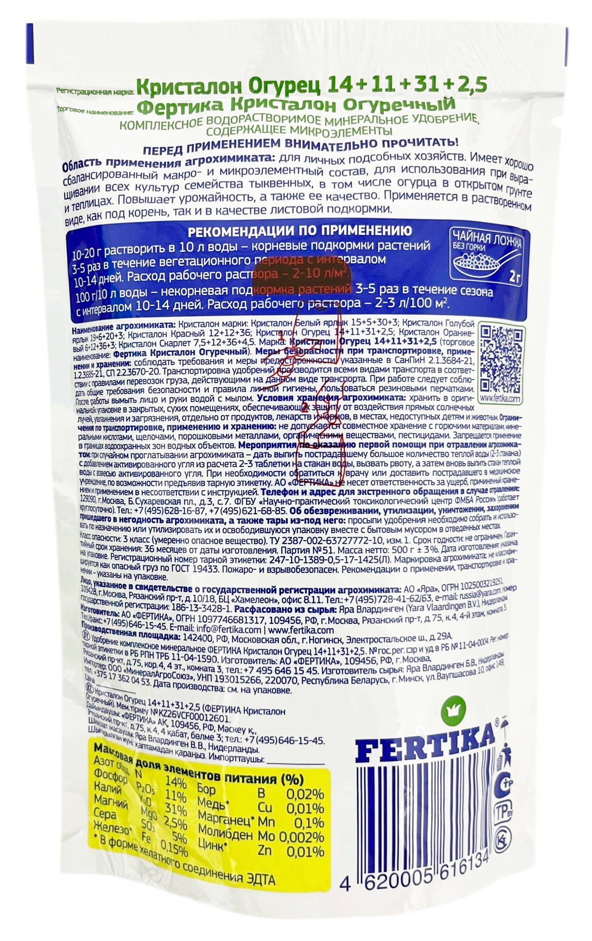 КРИСТАЛОН для огурцов 500г- Полностью водорастворимое комплексное азотно-фосфорнокалийное удобрение, содержащее микроэлементы;