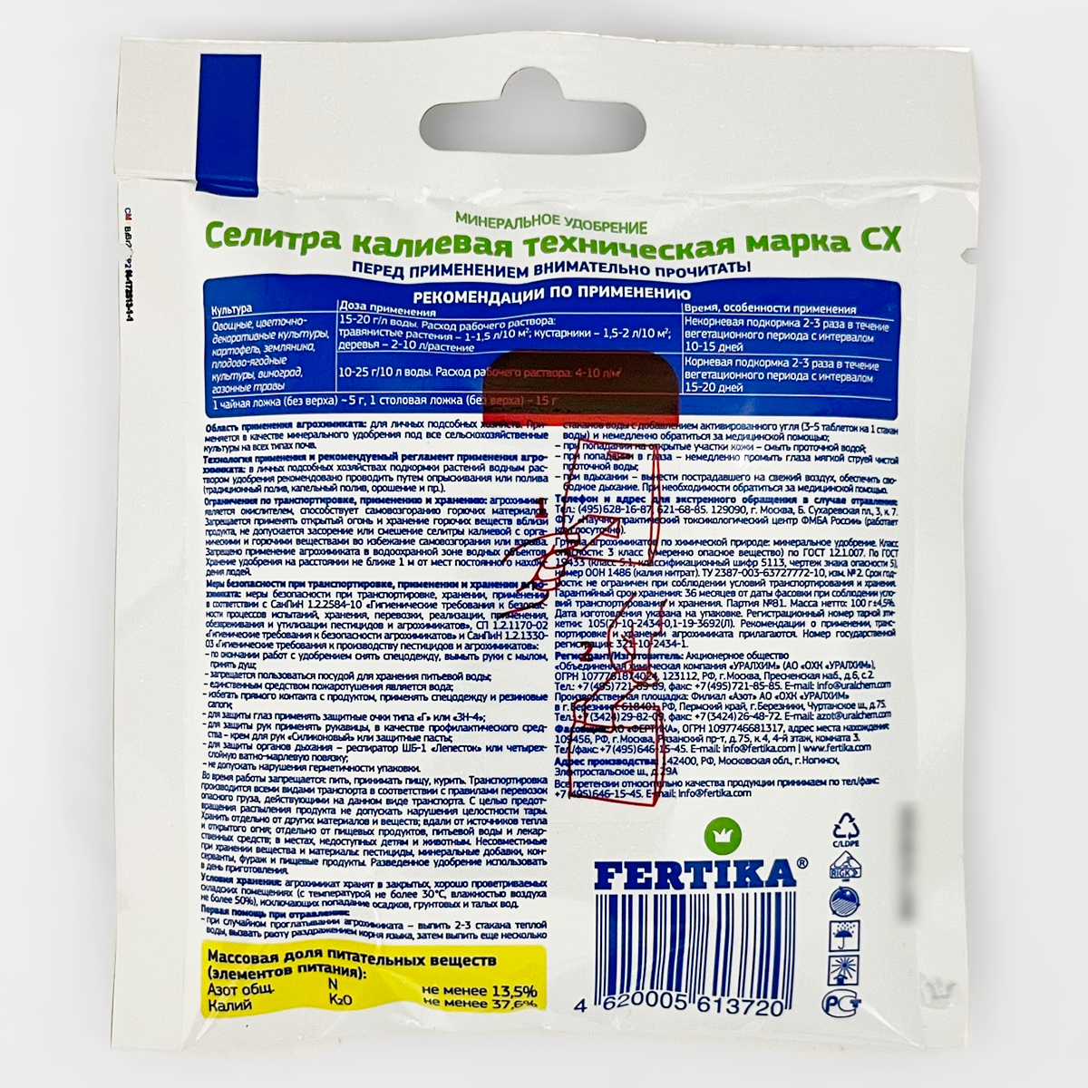 СЕЛИТРА КАЛИЕВАЯ Фертика 100гСостав: азот (N-NO3)-13,5%, калий (K2O) - 37,6%.