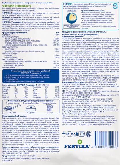 --Фертика Универсал-2 Весна-Лето 2,5кгСеменаПосадочный материалГоршки, кашпо, ящики для рассадыУкрашения и дизайн дачного участкаГрунтУдобрения, стимуляторыЯдохимикаты (пестициды)От комаров тараканов муравьев мышей крыс кротовИнструмент, оборудование садовоеТовары для животныхКухня садоводаФлористические материалыЛитератураФитолампыПоливочное оборудование