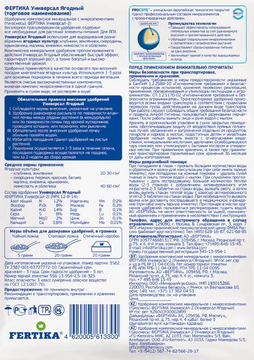 Рекомендуется для основного внесения и подкормки ягодных и плодовых культур.