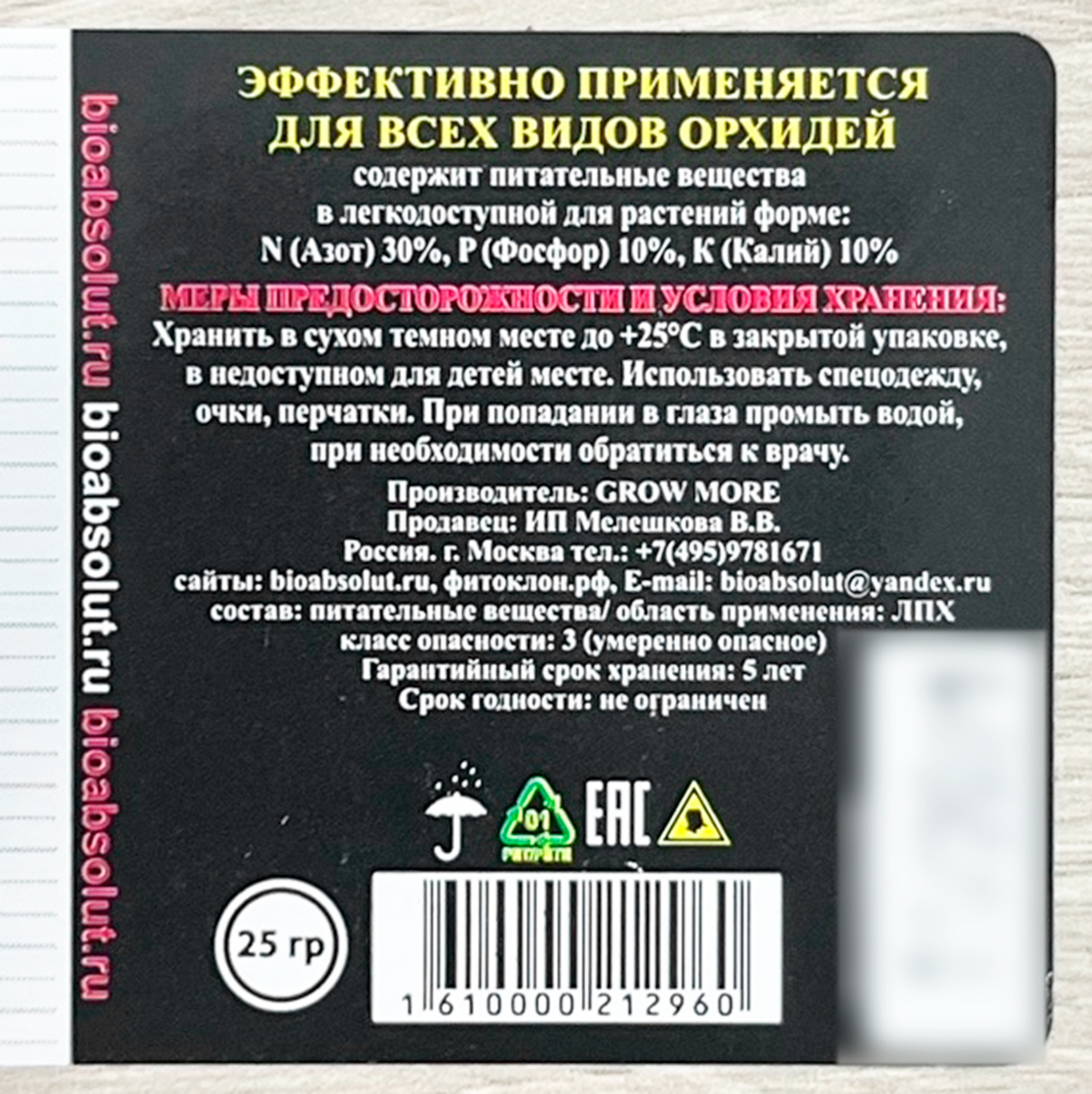 GROW MORE для орхидей удобрение ORCHID GROWTH FORMULA 30-10-10Уникальная высокоэффективная водорастворимое хелатное удобрение для орхидей. Стимулирует активный рост в первой фазе вегетации. Рекомендовано для любых видов орхидей и грунта. Особенности: не содержит мочевину, подходит для любых температур и климатических условия.