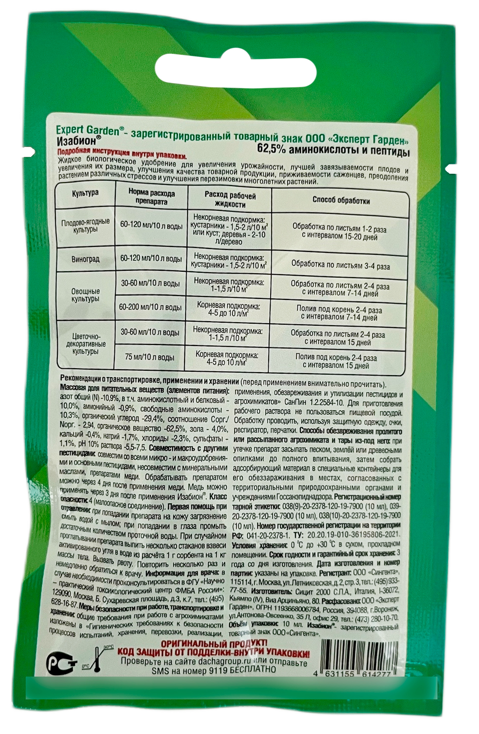 ИЗАБИОН 10 млЖидкое органо-минеральное удобрение, предназначенное для увеличения урожайности за счет лучшей завязываемости плодов и увеличения их размера, улучшения качества товарной продукции, приживаемости саженцев, преодоления растением различных стрессов и улучшения перезимовки многолетних растений.