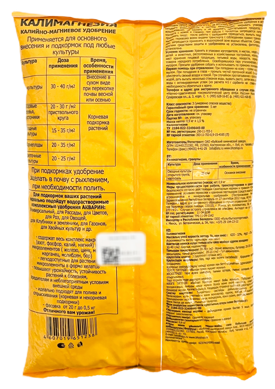 КАЛИМАГНЕЗИЯ 0,9кг Буйские удобренияКалийно-магниевое удобрение. Применяется для основного внесения и подкормок под любые культуры.