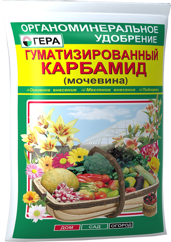 Удобрение органоминеральное. Массовая доля питательных веществ, мас. %, не менее: азот (N) не менее 44,0; соли гуминовых веществ – не более 1,0. Назначение: «Гера гуматизированный карбамид» – гуматизированное органоминеральное удобрение для основного внесения и подкормки различных видов культур. Содержит гумат, добавка которого увеличивает рост наземной и корневой части растений, повышает устойчивость растений к неблагоприятным воздействиям среды, болезням и вредителям, способствует повышению урожайности продукции, снижает содержание нитратов. Введение гумата позволяет повысить эффективность усвоения минеральных компонентов удобрения за счет перевода их в более доступную для растений форму.Характеристики