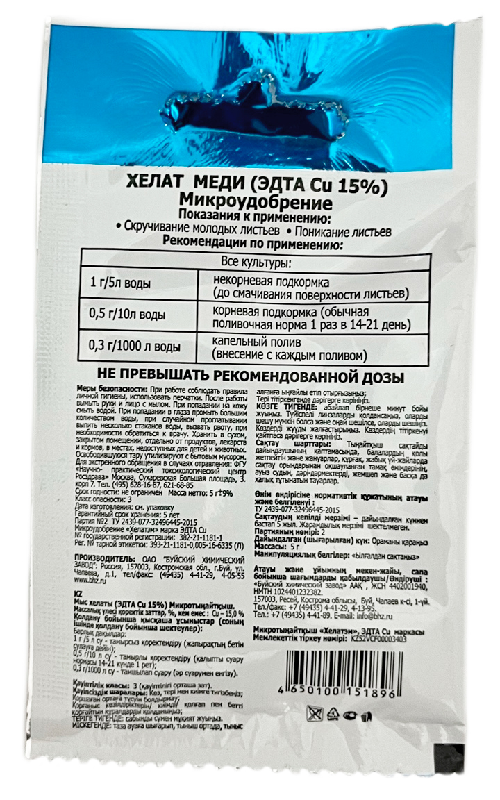 Хелат Меди 15% 5гКомплексное органическое соединение, которое улучшает интенсивность фотосинтеза, способствуют образованию хлорофилла, положительно влияет на углеводный и азотный обмены, повышает устойчивость растений против грибных и бактериальных заболеваний.