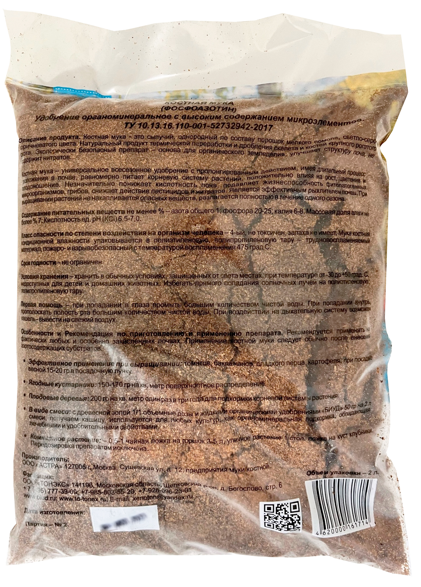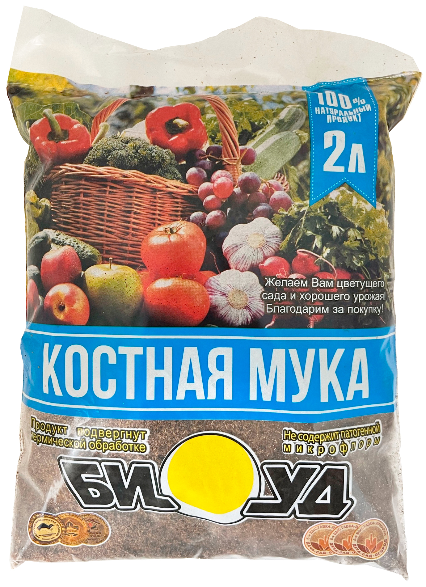 Костная мука 2лУниверсальная органическая фосфорная подкормка длительного действия. Активизирует рост корней и побегов, улучшает цветение, ускоряет плодоношение. Фосфор, содержащийся в костной муке, является источником энергии, который ускоряет формирование и созревание плодов. Кальций, содержащийся в костной муке, стимулирует рост корней, побегов, плодов.