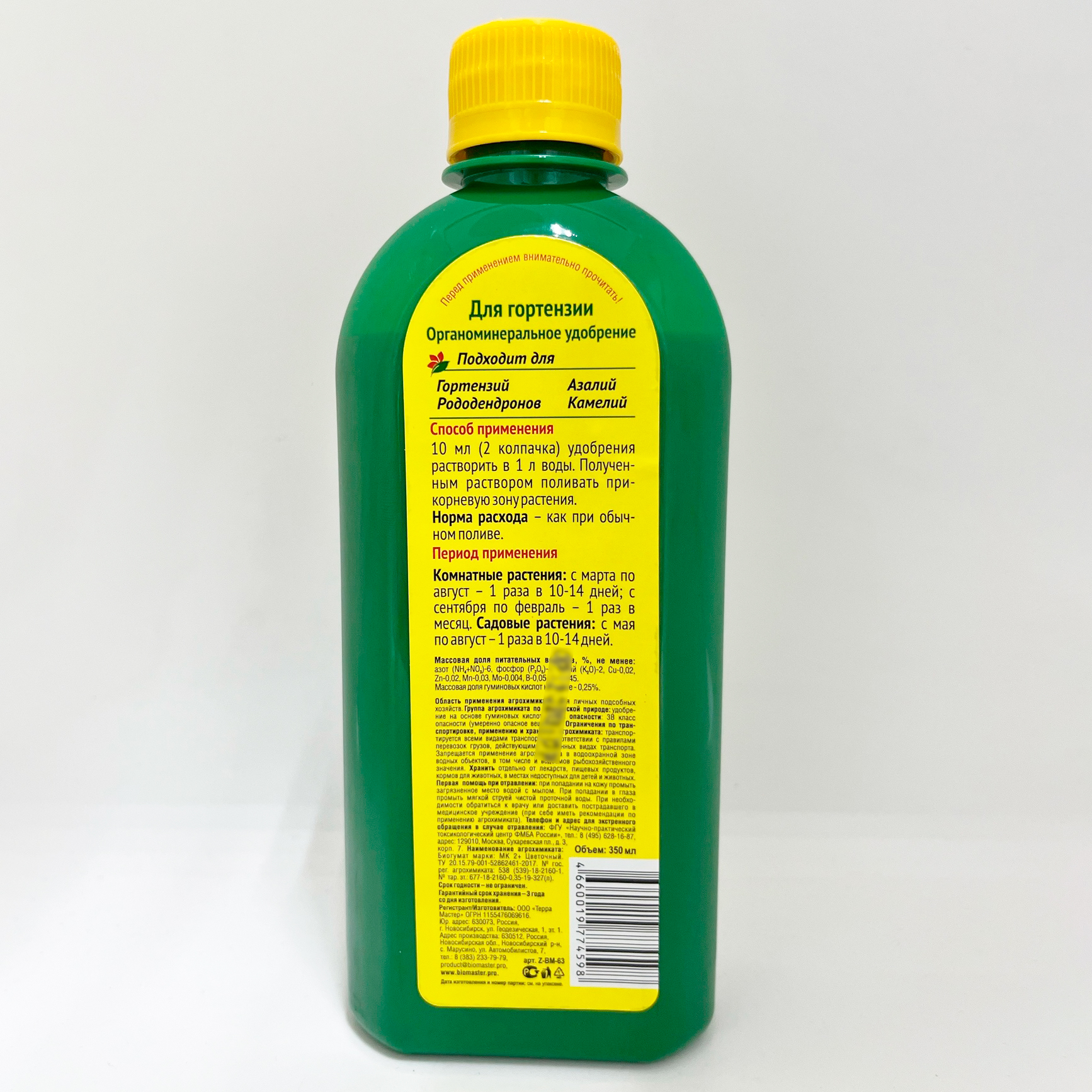 Удобрение содержит полный комплекс веществ, необходимых для полноценного и сбалансированного питания растений: массовая доля питательных веществ, не менее %: Азот - 6, Фосфор - 4, Калий - 2. Микроэлементы: железо, магний, марганец, бор, цинк. Массовая доля гуминовых кислот не менее - 0,25%