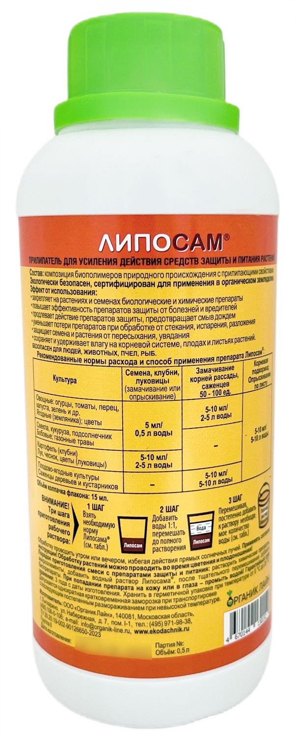 ЛИПОСАМ биоприлипатель 500млБиологический многофункциональный прилипатель Липосам используется для повышения эффективности и экономии средств защиты растений.