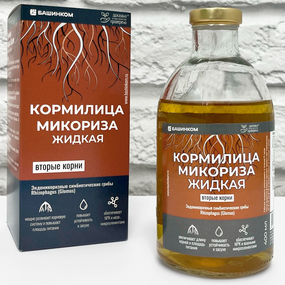 Кормилица микориза жидкая БАШИНКОМ 400млЖидкий микробиологический препарат на основе спор эндомикоризных симбиотических грибов рода Glomus. Увеличивает длину корней и площадь питания, повышает устойчивость к засухе, обеспечивает NPK и важными микроэлементами.