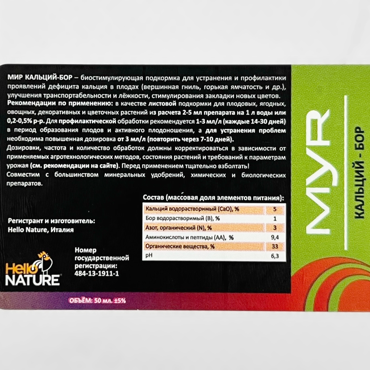 МИР КАЛЬЦИЙ-БОР 50млУдобрение MYR Calcium-Boron - биостимулирующая подкормка для устранения и профилактики проявлений дефицита кальция в плодах (вершинная гниль, горькая ямчатость и др.) улучшения транспортабельности и лёжкости, стимулирования закладки новых цветов.