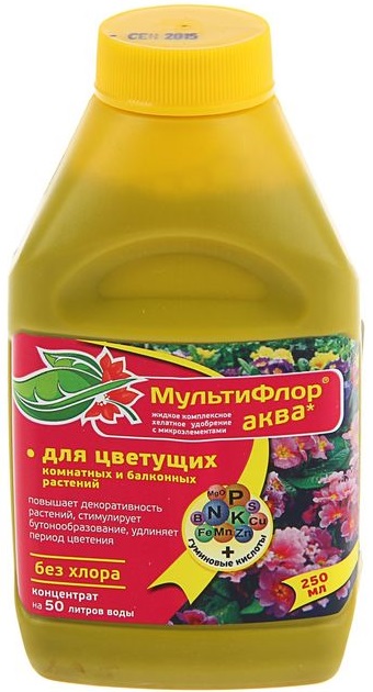 «Мультифлор Аква» — комплексное минеральное удобрение с микроэлементами и гуминовыми кислотами для подкормки цветущих комнатных и балконных растений (гардения, бальзамин, фиалка, герань, цикламен, бегония, хризантема, гербера, пеларгония и др.).Это универсальное средство применяется на любой стадии жизненного цикла растения. Способствует повышению декоративности цветка, стимулирует бутонообразование, удлиняет период цветения, укрепляет корневую систему.