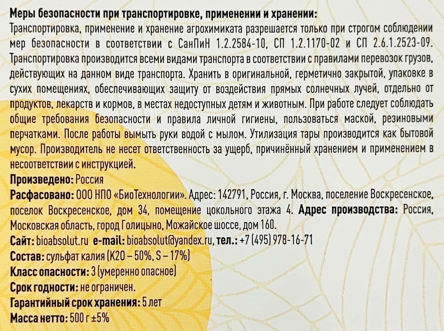 Состав: сульфат калия (K20 - 50%, S - 17%);