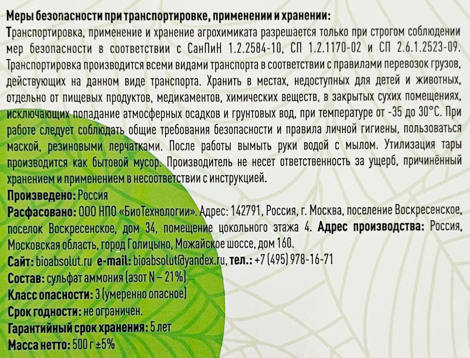 Состав: сульфат амония (азот N - 21%);