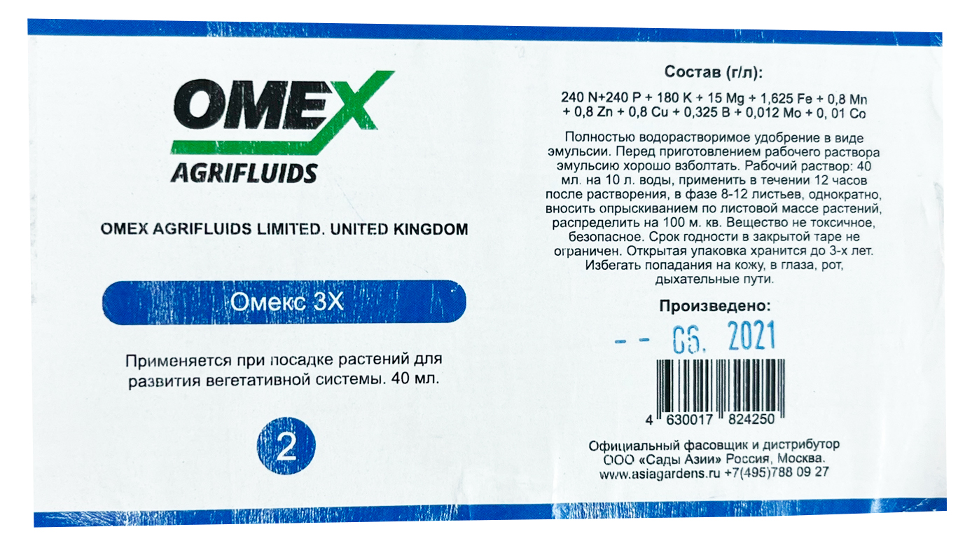 Хелат удобрение ОМЕКС 3X - для поддержки всех стадий развития растений.Состав (г/л): эмульсия водорастворимая, содержит NРК, магний и хелатированный набор микроэлементов: 240 N+240 P + 180 K + 15 Mg + 1,625 Fe + 0,8 Mn + 0,8 Zn + 0,8 Cu + 0,325 B + 0,012 Mo + 0, 01 Со