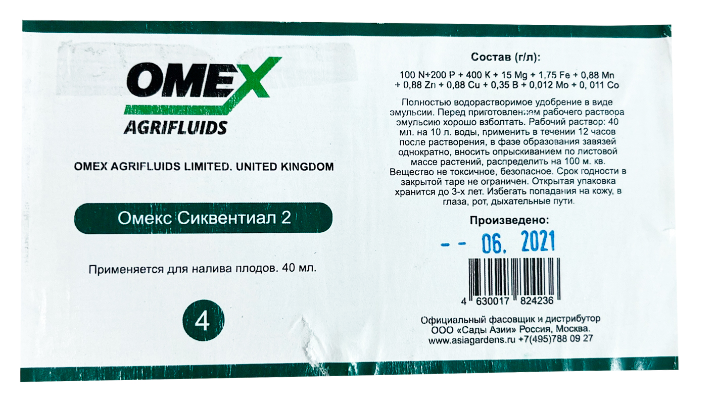 Хелат удобрение ОМЕКС Сиквентиал 2 - для оптимизации конечного этапа созревания и повышения качества плодов и овощей при уборке.Состав (г/л): водорастворимая эмульсия, содержащая NРК, магний и хелатированный набор микроэлементов: 100 N+200 P + 400 К + 15 Mg + 1,75 Fe + 0,88 Mn + 0,88 Zn + 0,88 Cu + 0,35 B + 0,012 Mo + 0, 011 Со