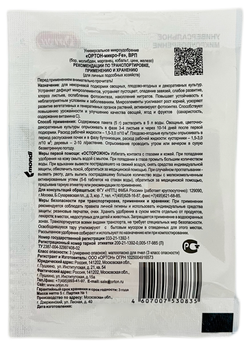 Микро FE ОРТОН 5гСодержит железо, бор, кобальт, марганец, цинк, молибден и др.