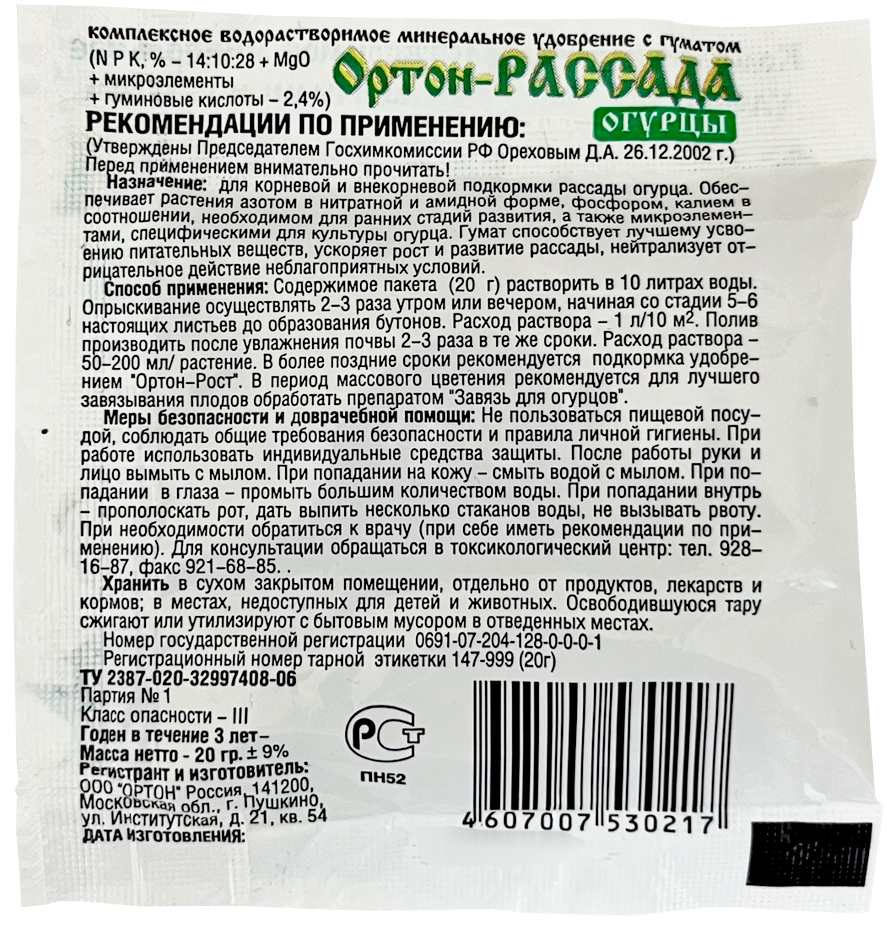 Ортон удобрение рассада Огурцы 20гКомплексное водорастворимое минеральное удобрение с микроэлементами и гумтом.