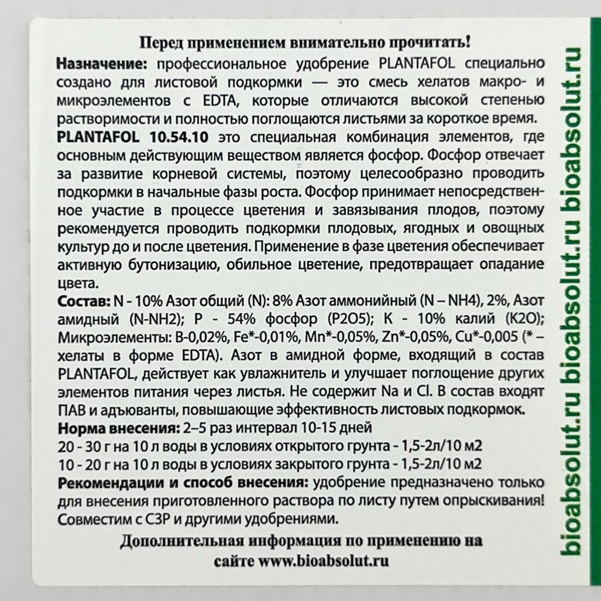 PLANTAFOL ПЛАНТАФОЛ 10 54 10 NPKНазначение: профессиональное удобрение PLANTAFOL специально создано для листовой подкормки — это смесь хелатов макро- и микроэлементов с EDTA, которые отличаются высокой степенью растворимости и полностью поглощаются листьями за короткое время.