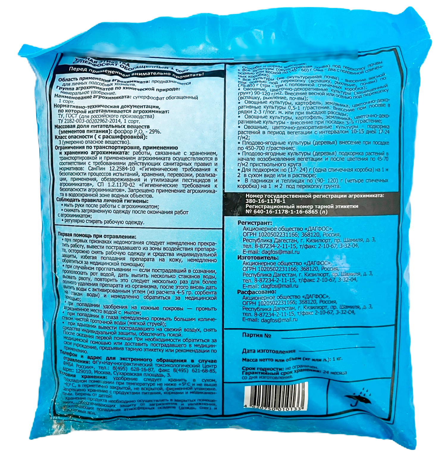 Суперфосфат ЛЕДА 1кгАзотно-фосфорное удобрение с содержанием фосфора 29%.