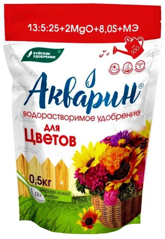 Удобрение Акварин для цветов, упаковка дой-пак 0,5 кг. Буйские удобрения. Водорастворимое комплексное минеральное удобрение. Назначение: Удобрение предназначено для подкормок поливом или опрыскиванием любых цветочно-декоративных культур в течение всей вегетации. При совместном использовании со средствами защиты растений снимает стрессовое воздействие ядохимикатов на растения. Описание товара: Акварин для Цветов - водорастворимое удобрение, в состав которого входит азот, фосфор, калий, магний, сера и микроэлементы – железо, цинк, марганец, медь в хелатной форме, а бор и молибден – в минеральной. Благодаря кислой реакции (рН) удобрения, оно легко растворяется в холодной воде и более эффективно усваивается корневой системой или листовой поверхностью растений. Рекомендуем хранить в сухом, прохладном месте. Готовые растворы использовать полностью. Способ применения: Подкормку растений проводят методом полива (традиционный полив, капельный полив, орошение и пр.), или опрыскивания. Состав: N (%): 13 P2O5 (%): 5 K2O (%): 25 MgO (%): 2 S (%): 8 Микроэлементы: Fe (ДТПА) – 0,054; Zn (ЭДТА) – 0,014; Cu (ЭДТА) – 0,01; Mn (ЭДТА) – 0,042; Mo – 0,004; B – 0,02 pH (1% p-pa): 3.5-4.0 Нерастворимый в воде остаток (%): 0.01Характеристики
