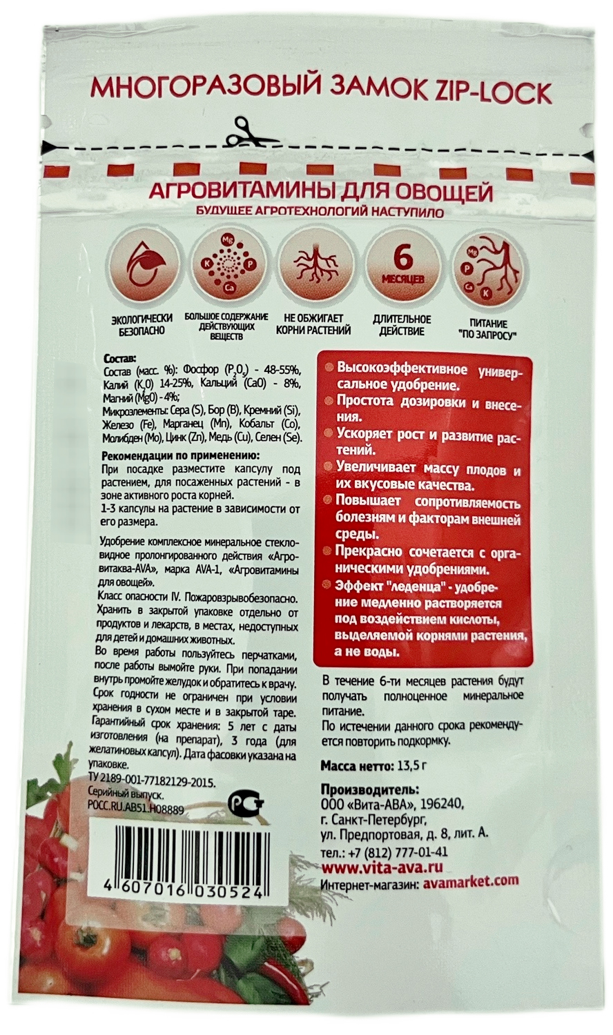 Агровитамины для овощей АVA 13,5гВысокоэффективное универсальное удобрение для овощей. Простота дозировки и внесения. Ускоряет рост и развитие растений. Увеличивает массу плодов и вкусовые качества. Повышает сопротивляемость болезням и факторам внешней среды. Прекрасно сочетается с органическими удобрениями.
