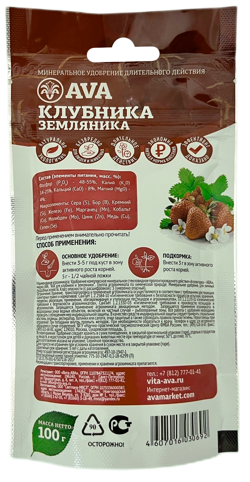 Удобрение AVA для клубники и земляники 100 г (дой-пак)Удобрение длительного действия для клубники и земляники. Обеспечивает ускорение плодоношения, развитие мощной корневой системы, увеличение размера ягод и улучшение их вкусовых свойств, повышение устойчивости к болезням, вредителям и неблагоприятным погодным условиям.