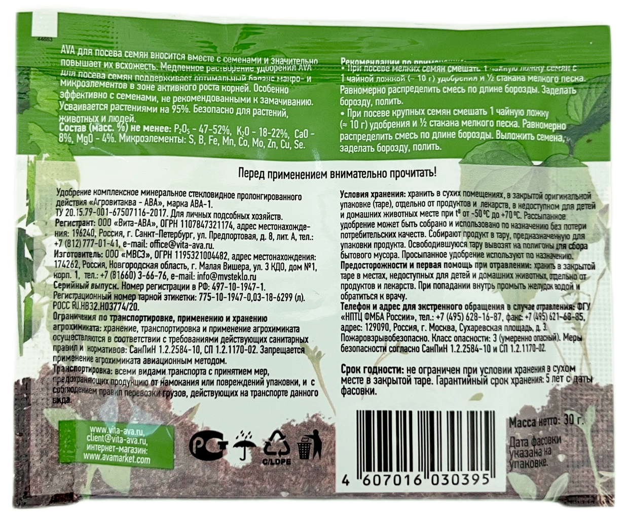 Удобрение AVA для посева семян 30гКомплексное минеральное удобрение длительного действия с микроэлементами. Особенности удобрения позволяют вносить его в почву вместе с семенами, что значительно повышает их всхожесть.