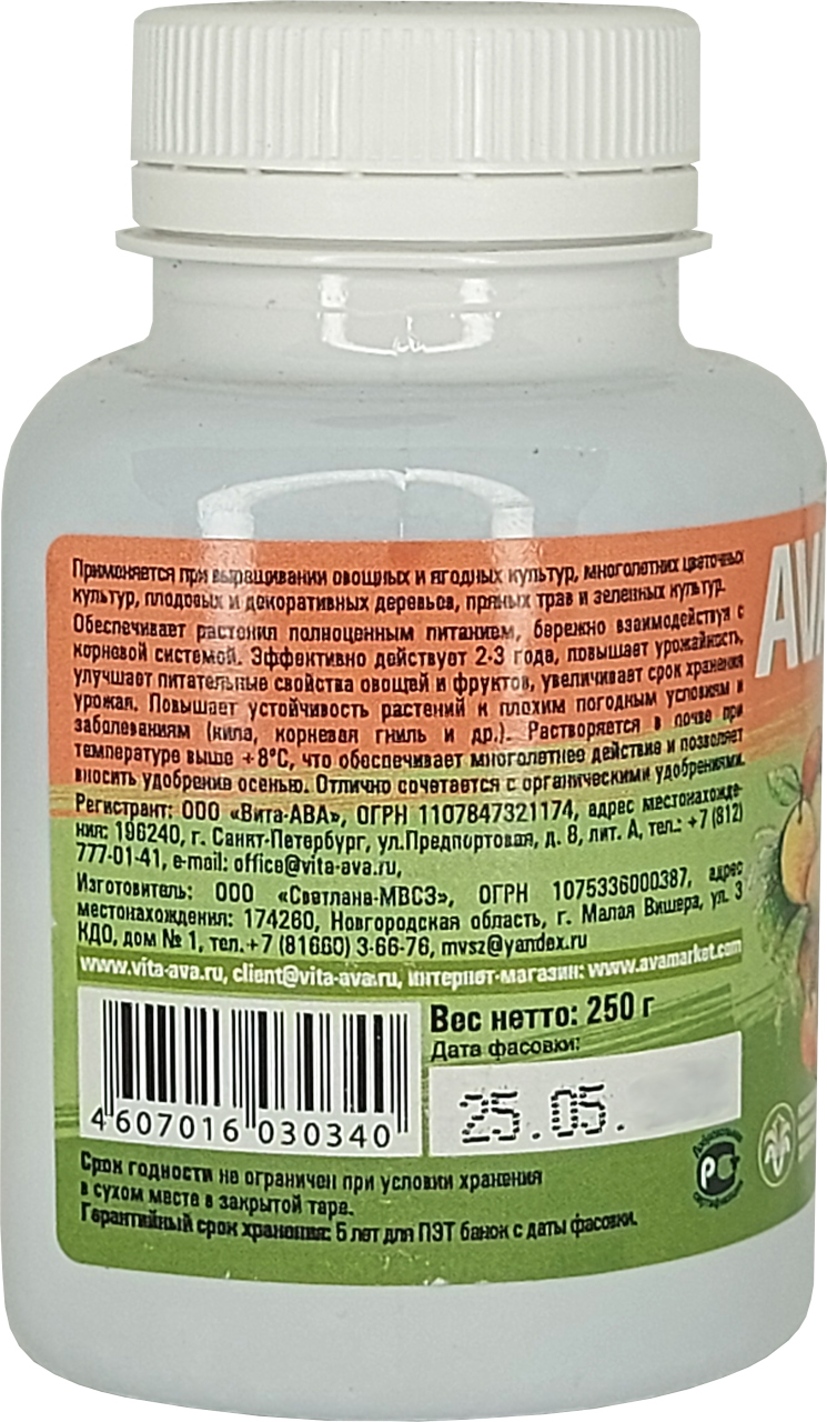 Удобрение АВА AVA Универсал (2-3 года) 250гОсновное удобрение пролонгированного действия (2-3 года) для выращивания многолетних цветов, кустарников, плодовых, хвойных и декоративных деревьев. Фосфор, калий и микроэлементы способствуют раннему и более дружному созреванию плодов, повышают устойчивость саженцев к различным болезням и вредителям.