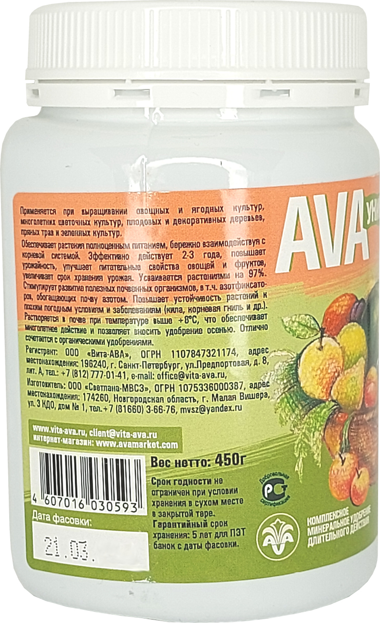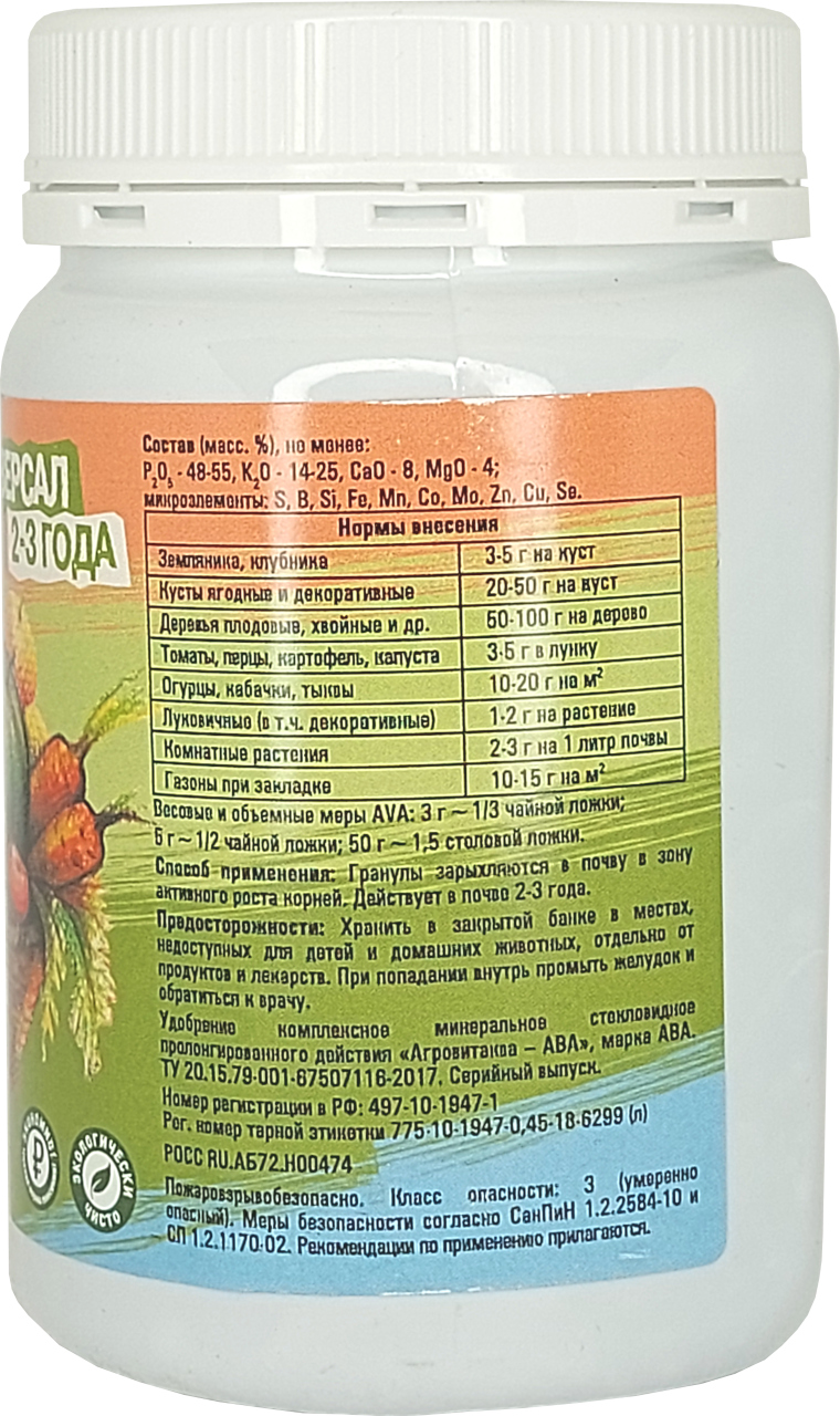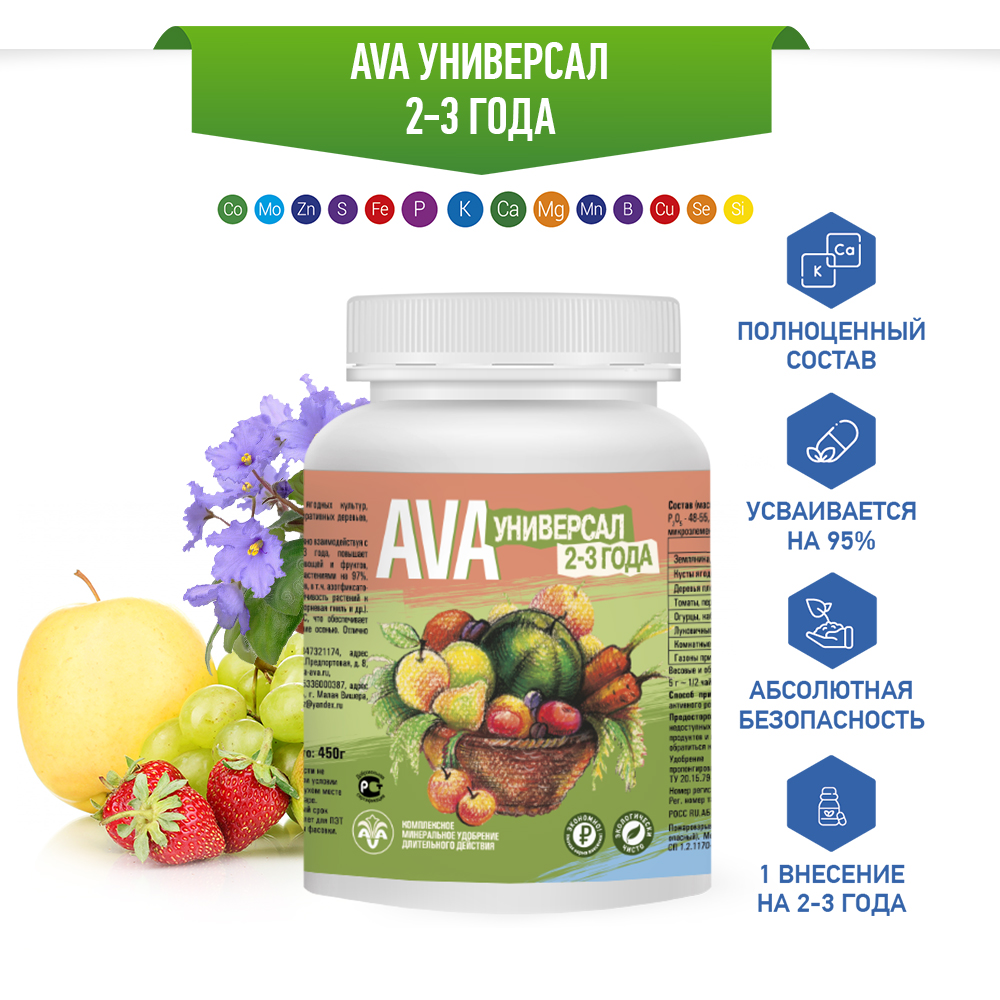 Удобрение АВА AVA Универсал (2-3 года) 450гОсновное удобрение пролонгированного действия (2-3 года) для выращивания многолетних цветов, кустарников, плодовых, хвойных и декоративных деревьев. Фосфор, калий и микроэлементы способствуют раннему и более дружному созреванию плодов, повышают устойчивость саженцев к различным болезням и вредителям.