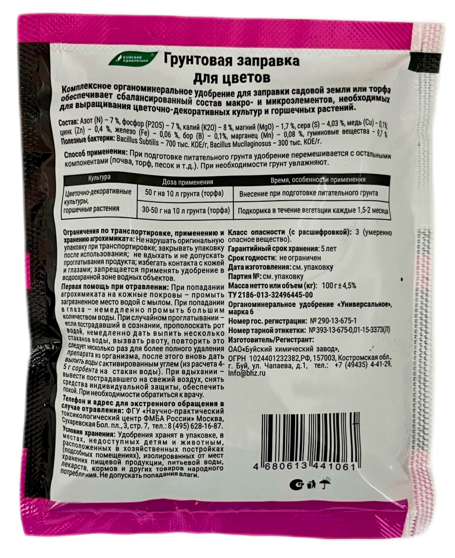 Грунтовая заправка для цветов 100г Буйские УдобренияКомплексное органоминеральное удобрение для заправки садовой земли или торфа.