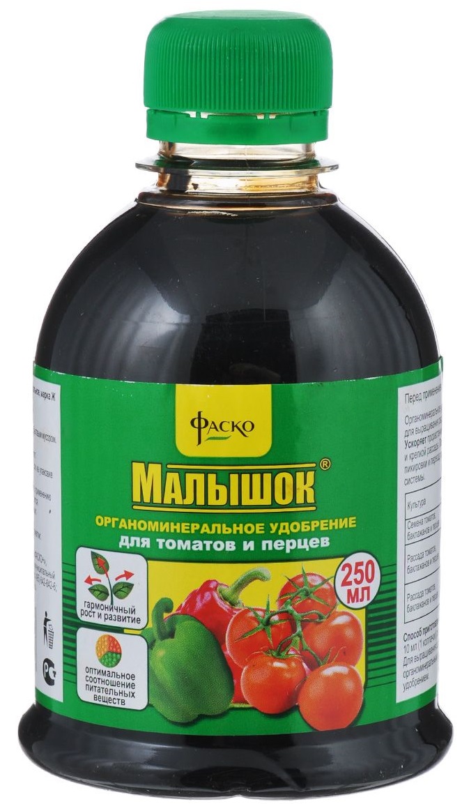 Удобрение органоминеральное Малышок для томатов и перцев - жидкое комплексное органоминеральное удобрение с гуматами и природным стимулятором специально разработанное для применения при выращивании рассады томатов, баклажанов и перцев- Оптимальное соотношение питательных веществ для гармоничного роста здоровой и крепкой рассады;