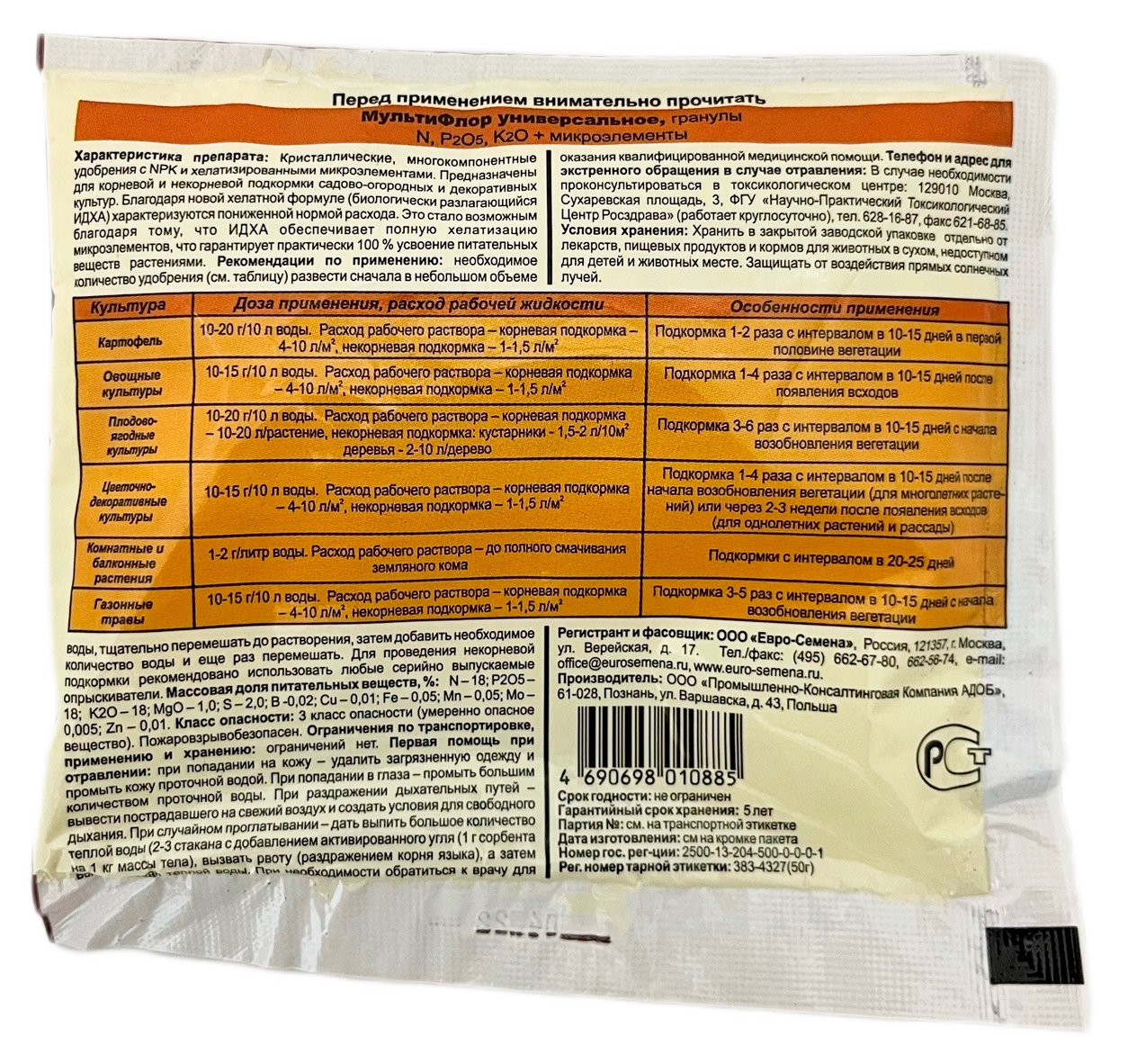 Удобрение МультиФлор УниверсальныйМультиФлор универсальное – кристаллическое, многокомпонентное удобрение с NPK и хелатизированными микроэлементами. Применяется для корневой и внекорневой подкормки садово-огородных и декоративных культур. Препарат характеризуются пониженной нормой расхода и практически 100 % усвоением питательных веществ растениями.