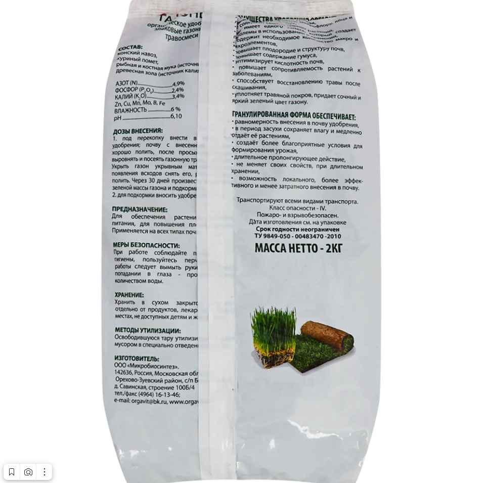 Удобрение Оргавит газоны 2 кгСостав: конский навоз, куриный помет с добавлением рыбной и костной муки (источник фосфора), древесная золя (источник калия) макроэлементы, не менее: общий азот (N)- 4,9%; общий фосфор (Р) - 2,4%; общий калий (К) - 3,4% Zn, Cu, Mn, Mo, B, Fe Влажность не более 6% pH- 6.1
