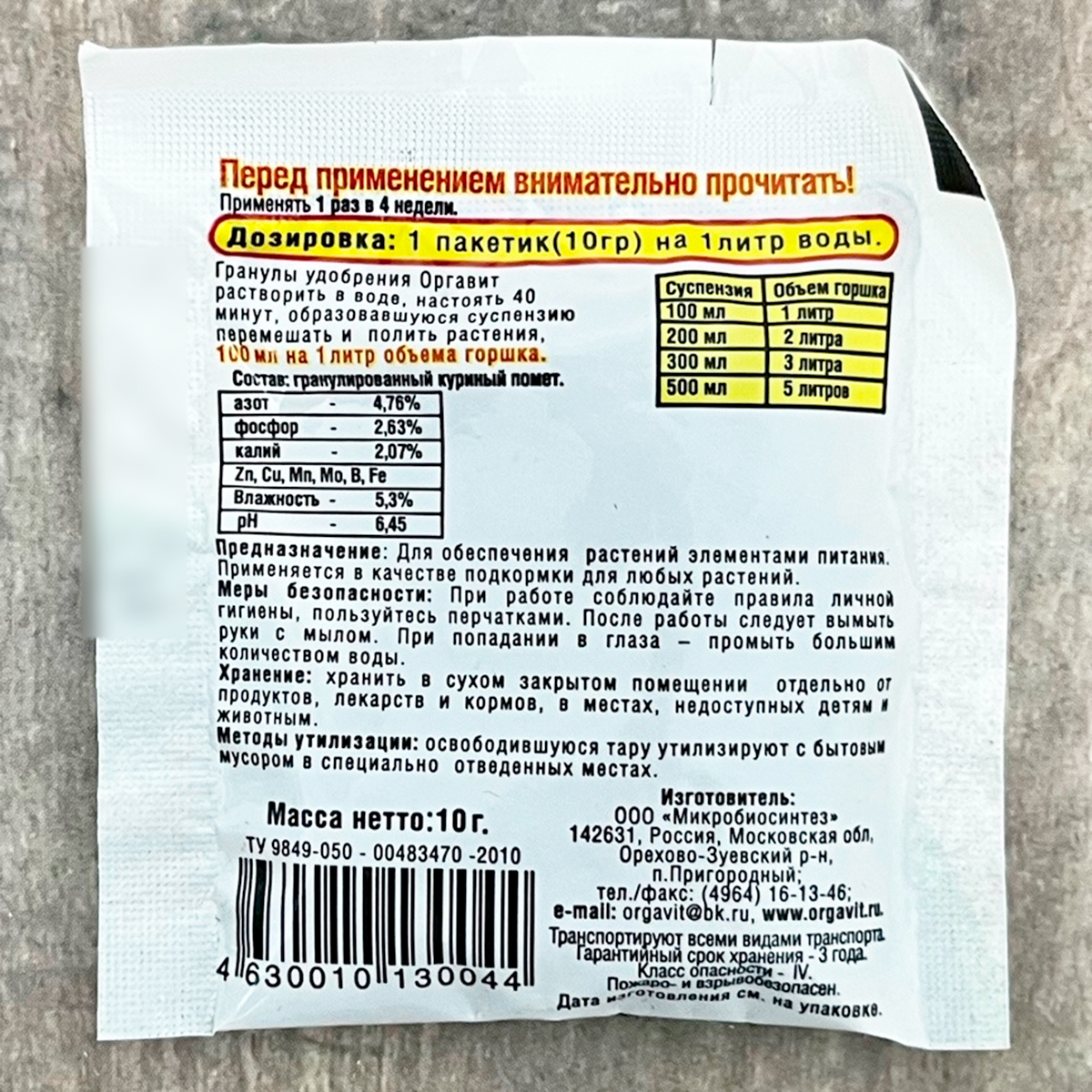 Удобрение Оргавит Куриный 10гУдобрения из куриного помета